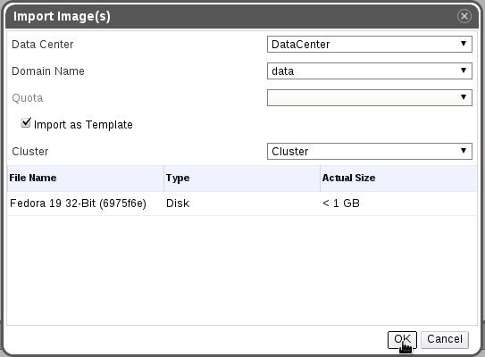- As stated above, import as a template work only on Data-Centers with compatibility level that's 3.4 and above. Currently we also allow that on 3.3, but that's a bug, as the template will be created, but you won't be able to create VMs from it. This will be addressed in 3.4.1.